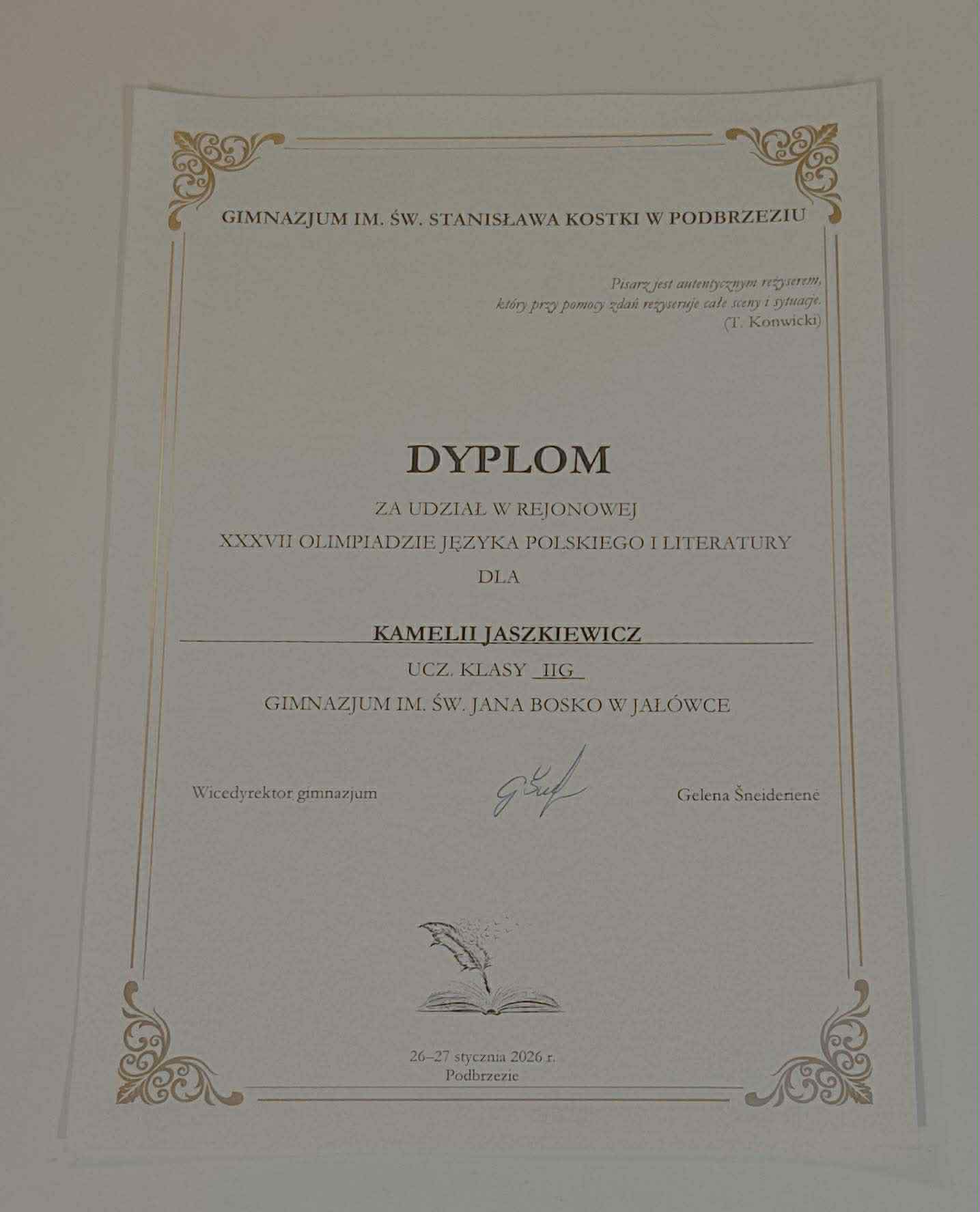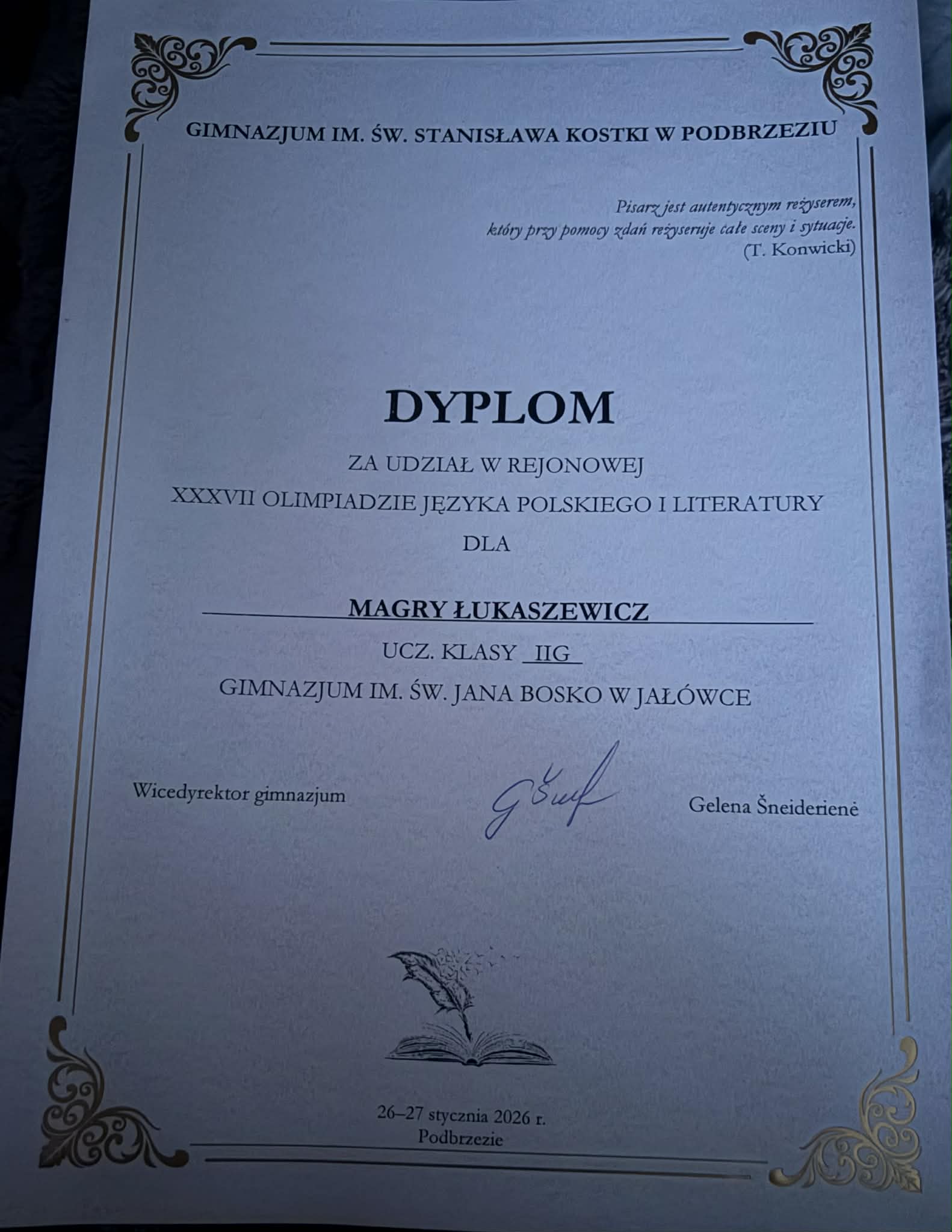 26 i 30 stycznia w Gimnazjum im. św. Stanisława Kostki w Podbrzeziu odbył się rejonowy etap XXXVII Olimpiady Języka Polskiego i Literatury. Do zmagań konkursowych przystąpiło 21 uczniów klas 10- 12 z różnych gimnazjów rejonu wileńskiego. Nasze gimnazjum reprezentowały dwie uczennice II G A klasy: Kamelia Jaszkiewicz oraz Magra Łukaszewicz. Dziewczyny poświęciły wiele czasu szykując się do ustnej odpowiedzi i pisania rozprawki.