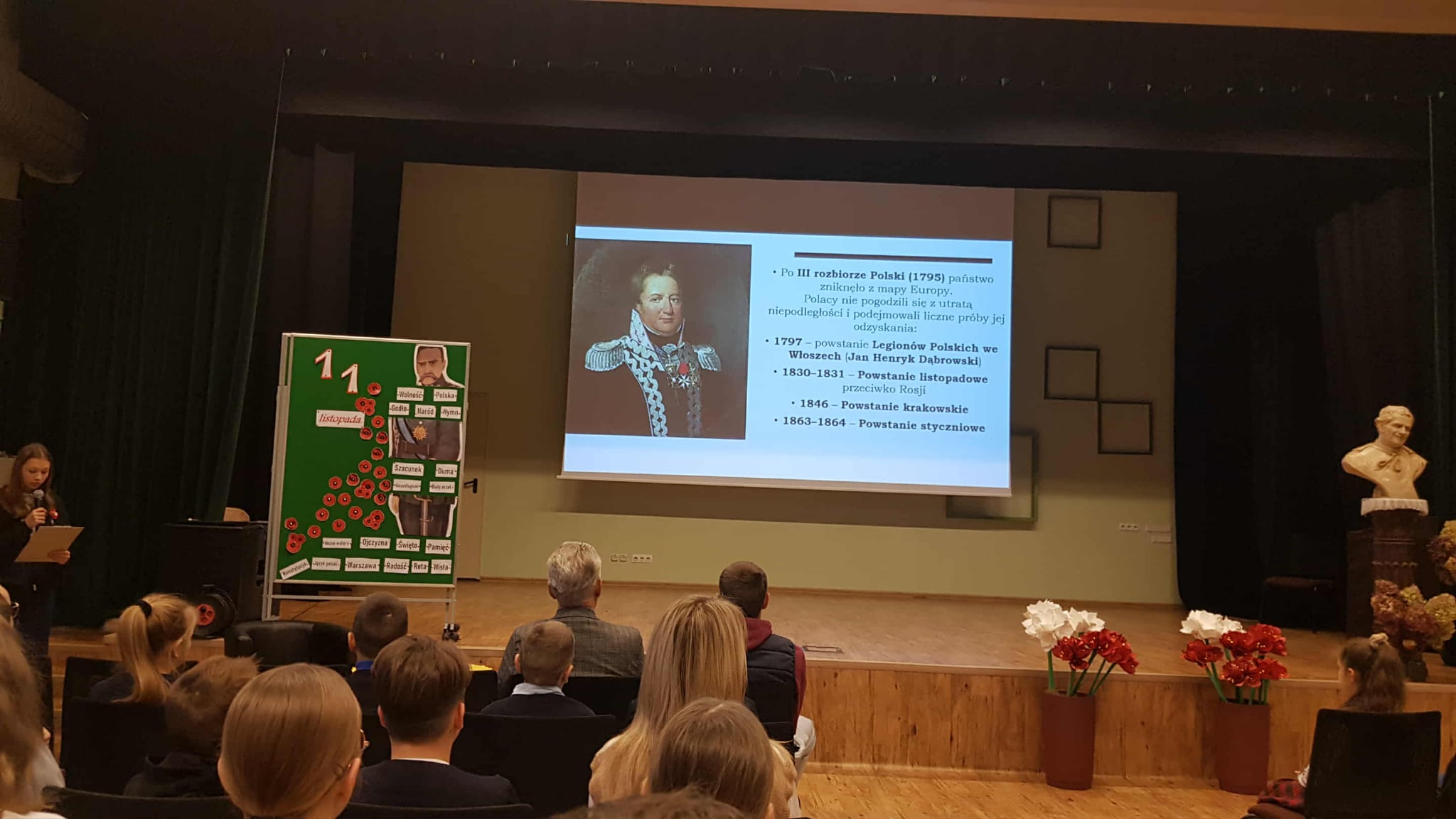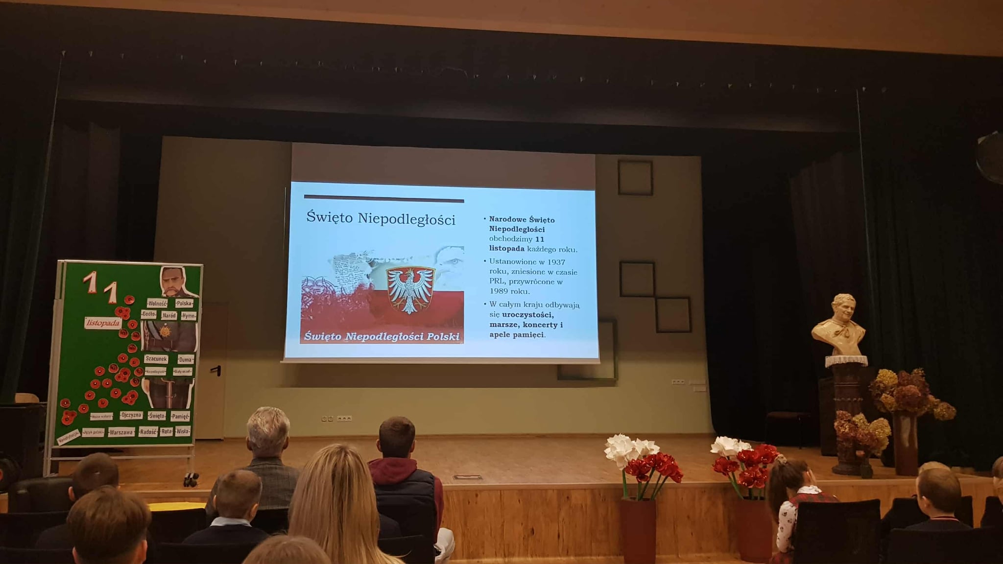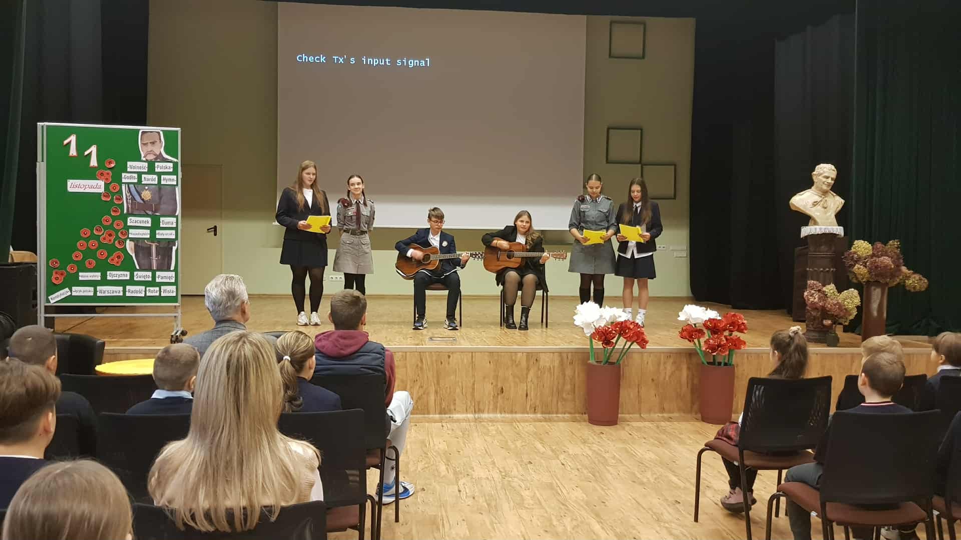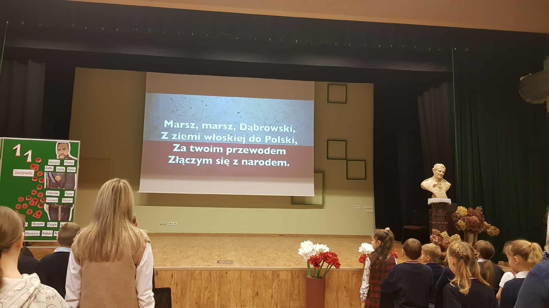 Ten ważny dla wszystkich Polaków dzień rozpoczęliśmy uroczystym apelem. Po odśpiewaniu „Mazurka Dąbrowskiego” wysłuchaliśmy i obejrzeliśmy prezentacji o trudnej drodze Polaków do niepodległości. Na krótki program artystyczny złożyły się piosenki zaśpiewane przez Anię Kozłowską i uczniów klasy IG. Na tę okazję został nakręcony filmik „Droga do wolności”, który zrealizowały Oliwia Murawska i Maryla Misiewicz.