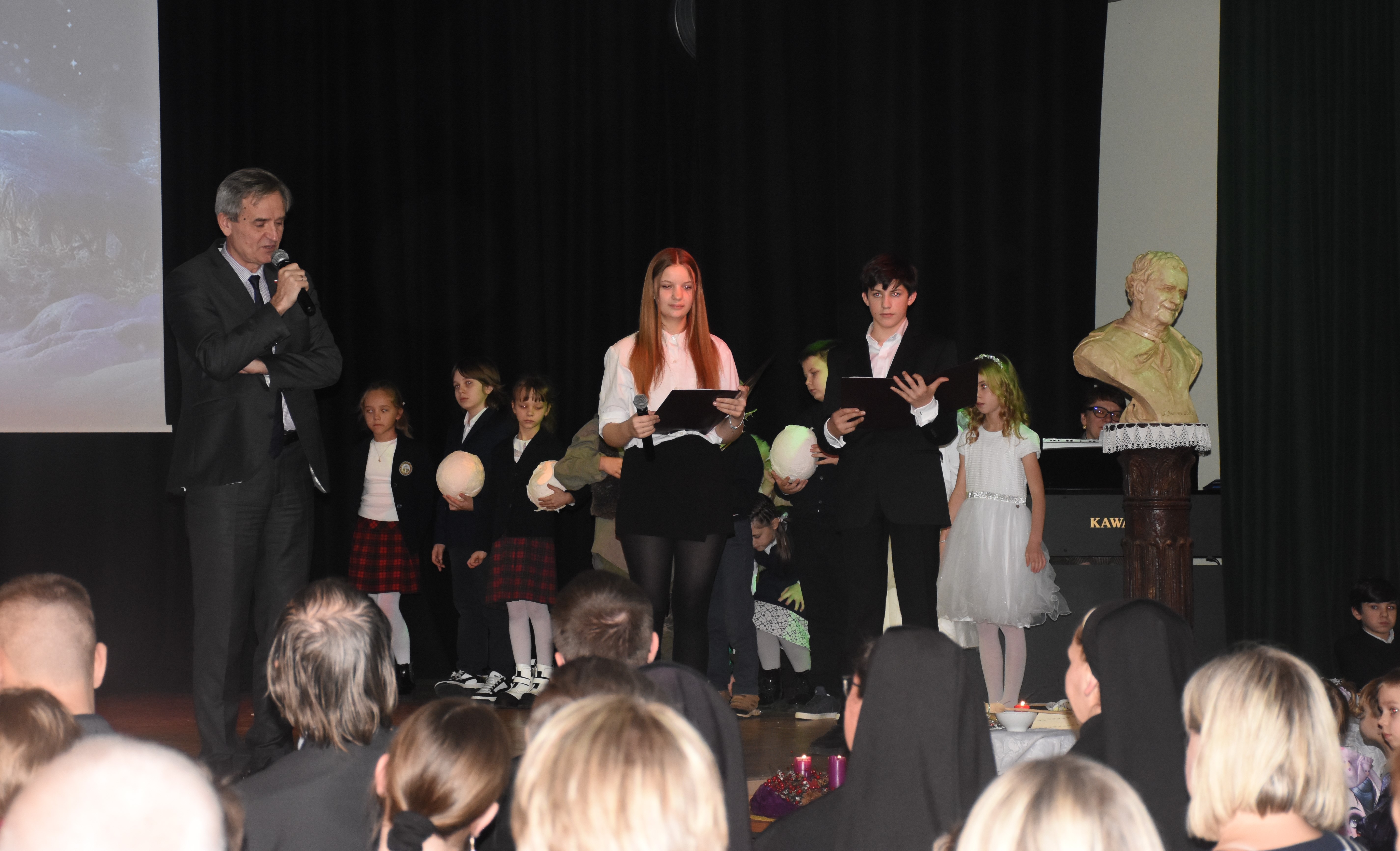 Sercem całej uroczystości były jasełka, przygotowane z ogromnym zaangażowaniem przez uczniów i nauczycieli. Wszyscy z zainteresowaniem obserwowali występy uczniów, a wielu z nich nie kryło emocji. Scena wypełniła się światłem, kolędami i dziecięcą radością, a przedstawienie — choć oparte na dobrze znanej historii — poruszyło swoją prostotą i szczerością.