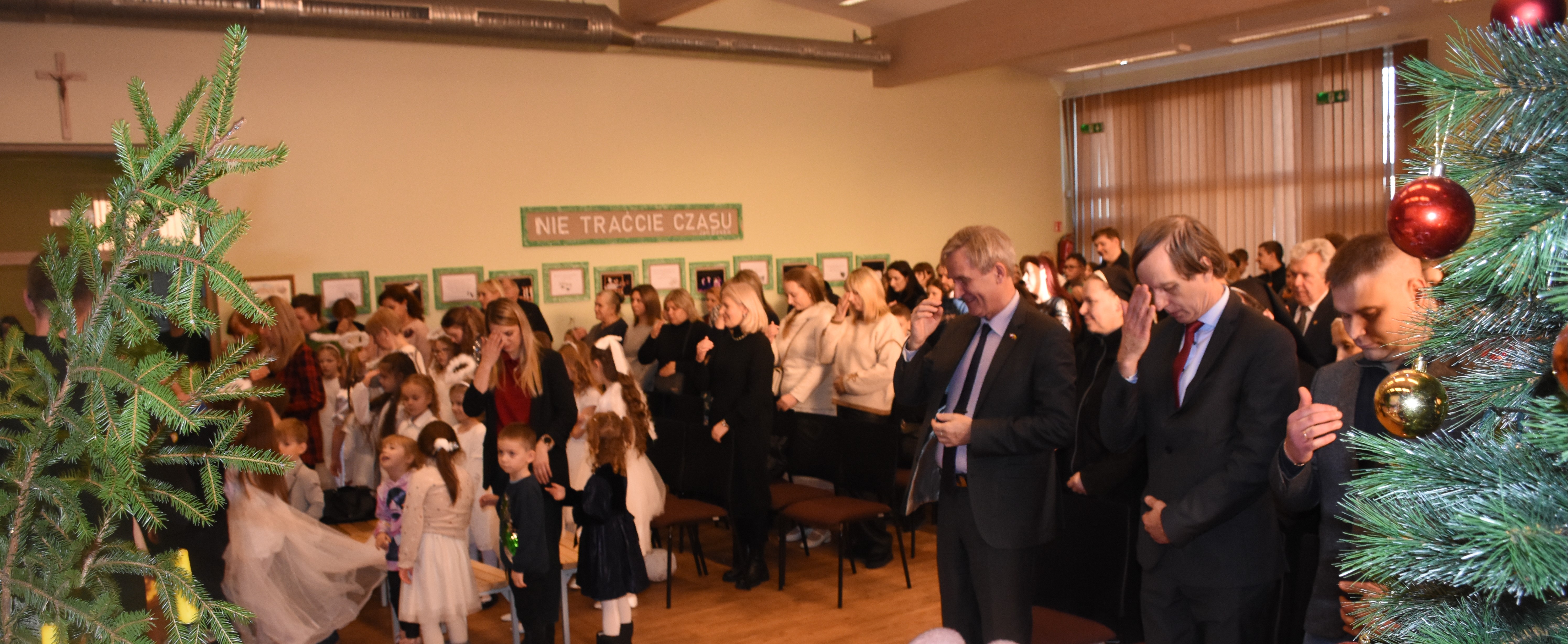 Po zakończeniu występu nadszedł moment wspólnej modlitwy. W ciszy, która zapadła w sali, można było poczuć jedność całej szkolnej społeczności. Słowa modlitwy wypowiadane przez księdza Daniela Narkuna brzmiały spokojnie i z głębi serca, niosąc ze sobą wdzięczność za mijający rok oraz prośbę o dobro, pokój i wzajemne zrozumienie.
